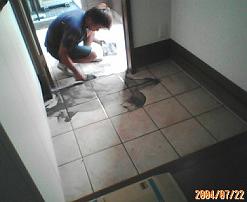 ついにウッドデッキも出来上がり、僕はBBQを想像し、満足満足♪そんな夢見がちな僕を尻目に・・・誰に似たんだか“働き者”の息子は 「ドロがいっぱいちゅいてましゅよ〜!!」 と、なぜか掃除に精を出していたのであった。 ちなみに玄関のタイルも最終作業、目地へのモルタル詰め(クリック!)の段階に入っていた。 (こうやって目地にモルタルを詰めるとは思いませんでした〜。建築技術、万歳!!ですね) この作業は単純そうなのだが…結構慎重に時間をかけてやるものらしい。 …と、いうわけですっかりお腹もすいてしまったボクラは、後ろ髪を引かれる思いではあるものの… 「あとは最後の片づけまでやっときますから、帰っていただいてもいいですよ〜」 なんていうタイル職人さんに甘えて、乾燥を待つ玄関(クリック!)を後にしたのであった。 サテ・・・ついに明日は引越しである。 「パパ、お庭のウッドデッキ、カッコよかったね♪」 なんていう息子の言葉にすっかり喜んでしまい、軽やかに、最後となる“マンションへの帰路”を運転する…僕なのであった。 7月23日(金曜日)…ついにお引越しです!!すっかり真夏です!! 「9時には引越し屋さん来ちゃうんだからね!7時には起きてもらうんだからね!今日は早く寝てね!!」 と、引越し前日の余韻もないまま、妻に急き立てられるように早寝をしたはずだったが… やっぱり寝坊で8時起きのボクと息子である。 「だって、今ボク夏休みだし〜。なんか夏休みにこんな早起きするのて、なんか損してるみたいだし〜」 と、言ってはみるものの、聞こえるのは「早く着替えてね!」という声だけである。 そう!今日は引越し日なのである!! そして屈強なお兄ちゃん達がドカドカやってきて、我が家の荷物を「わっひょ〜ぃ!!」と、あっという間に持ってっちゃうわけなのである。 感慨・・・なんていってる場合じゃないのである。 もう引越しの準備(クリック!)は(ほとんど妻の努力によって)万全! 和室は110箱のダンボール(クリック!)で埋め尽くされているのである。