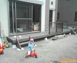 ダイニングからは太陽が西日に移り、ちょうど日陰になった部分で作業をする大工さんが見えた。「ごくろうちゃまで〜っちゅ!!」 息子よ。またまたグッジョブ!である。声もさらに大きく出てたぞ。 大工さんもニッコリ♪である。 とは言えまだウッドデッキは基礎と柱(クリック!)の段階である。 「上に乗りたいでしゅ〜!!」 と、いう息子を抱え、2階へ移動♪である。 2階での新発見は…というと、 ベランダの日差し口に落下防止のバーが付いていた(クリック!)こと、さらにベランダに物干し竿留め金具が取り付けられていた(クリック!)こと、そして2階の寝室に干し姫様(クリック!)が取り付けられていたことぐらいであろうか? まあ、ミサワホームに忘れられていた工事がようやく完了した…ということで別段の驚きは無いのではあるが。 ちなみに2階の子供部屋から庭を覗いてみるとこんな感じである(クリック!) ウッドデッキ、いい感じじゃない〜?! 早くあそこでビールでも飲んでみたいもんである。 さらに、蔵階のお風呂場から玄関の作業状況を覗いてみるとこんな感じ(クリック!)。 明日の完成に向けて、タイルがずんずん♪と進んでいるようである。 玄関前からアップで見るとこんな感じ(クリック!)である。 と、いうことで満足♪である。夕方になり、今日は帰ることにした。 「こっちは順調だったよ♪ところで引越しの準備も順調ですかぁ?」 帰る前に…とご機嫌伺いも兼ねて(笑)、妻に電話♪である。 「お母さんが来て手伝ってくれて…かなり進んだよ。ところでね、そういえば…なんだけど…明日エアコンの取り付けらしいんだよね〜。これはさあ、あの電気屋さんのおじさんなんか心配だし・・・見に行った方がいいんじゃないかなあ〜。」 「アイアイサー!!」 …と、いうわけで二日続けての現場登場!となる… と、いうか明後日の23日が引越しなので、このまま僕は毎日新しい我が家へ行き続けることが確定した…わけである。 7月22日(木曜日)…エアコンの設置とウッドデッキ&玄関タイル工事のフィニッシュを見に行きました。 「また行くの〜?」 引越し準備のラストスパート!でお義母さんと燃えまくっている妻にバイバイ♪をした直後の、新しい我が家へ向かう車の中で息子はそう呟いた。 「でもね、今日はあっちのお家にエアコンが付くんだよ。そしたら涼しいよ〜。もうこっちの家は暑いでしょ。」 適度に頷く息子にさらに追い討ちである。 「しかも明日からはずーっとあっちの家だよ。もうマンションとはバイバイなんだよ」 「ふーん♪涼しいならいいね♪」 と、あっさり息子もご納得!!なほど、ついに猛暑がやって来つつあったのである。(今思い起こしてみても、この夏は観測史上まれにみる猛暑でした) …と、寝坊やらモタモタやら…いつものようにしていた…ということで、“新★我が家”についたのは午後の一時を少し回ったところだった。 今日来た目的… それは、よく人の建築日記HPなどで『エアコンの取り付け位置や高さ、仕上げの綺麗さなどは、よーく監視してないと結構いい加減にされちゃうよ〜♪』…なんていう記述を読んだから…ってのもあった。 さて!!監視するぞぉ!! …と、意気揚々とリビングに入ってみると… エアコンはもう付いてた(クリック!)。 ありゃりゃ?…と思って2階の寝室に行ってみると…そこにももうエアコンさんはこんにちは♪(クリック!)。 いや〜きれいに付けてくれてます♪…(しかしなんでこんなに建築業界の人は朝が早いんでしょう?広告業界にどっぷりはまった僕にはつらいです)。